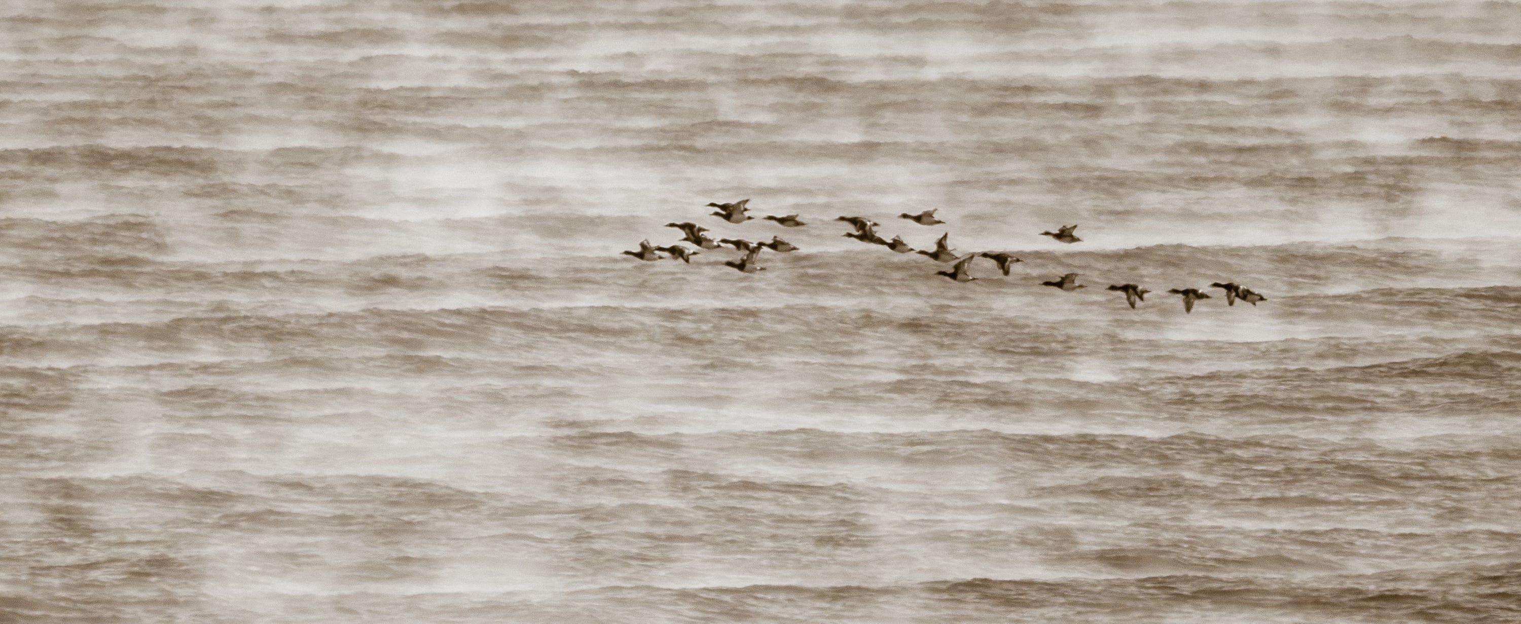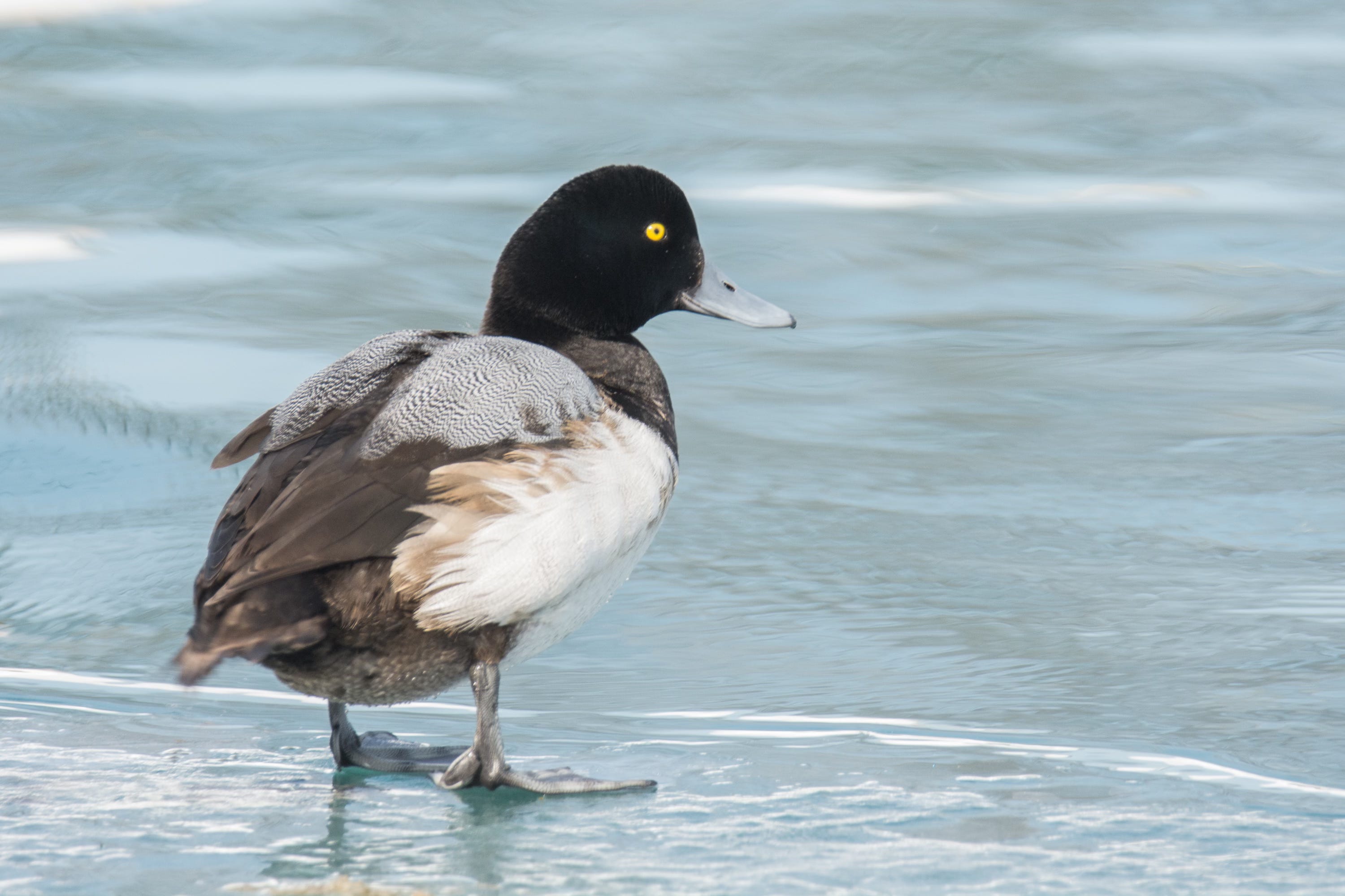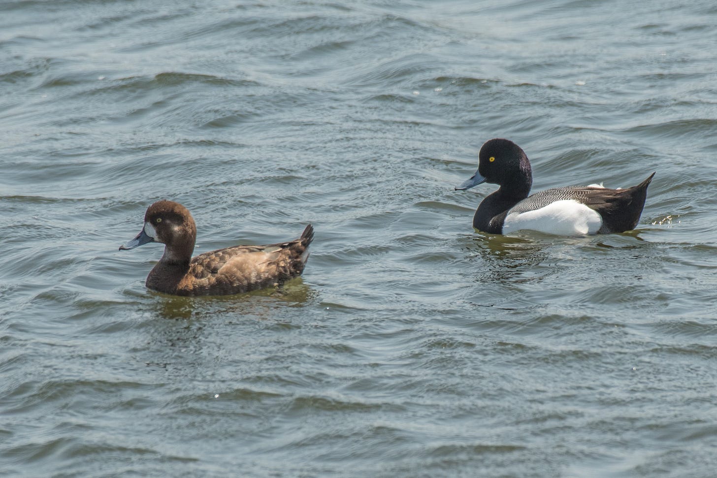 The Greater Scaup is not a colorful bird, but the soft browns of the female, with her daub of white where the blue bill meets the face, and the sharply contrasting whites and blacks of the male make it a strikingly handsome bird. A flock of fifty to a hundred Greater Scaup flying across gray Lake Michigan on a cold, gray winter morning, when you can’t tell where the horizon ends and the sky begins, is an uplifting sight. For a brief second the birds disappear, as they bank toward you. Then when they bank away, their bright white bellies sparkle, a flash of jewels amid the somber surroundings.