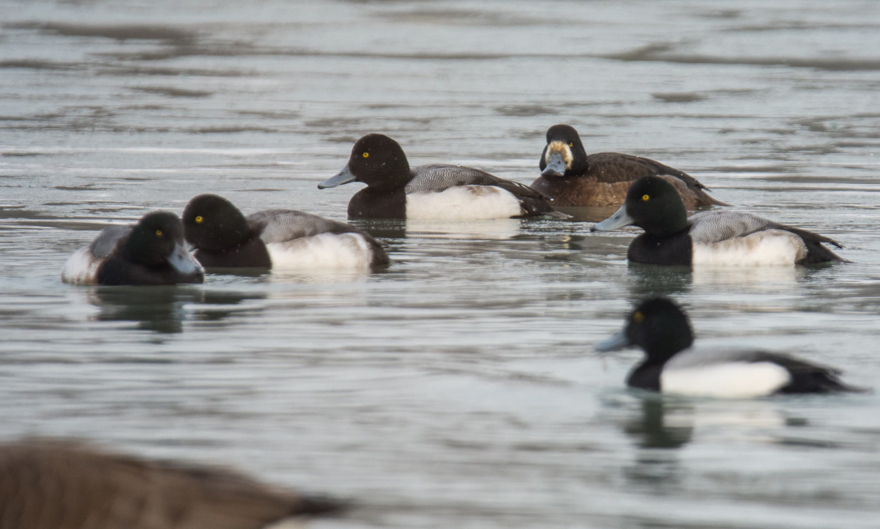 As if to make up for missing their number one billing spot, while I stood there flock after flock of Greater Scaup came flying in to join that first small group I had seen—but not confirmed—earlier. Within five minutes there were about 500 birds out on the water, most of them Greater Scaup, with Redheads mixed in.