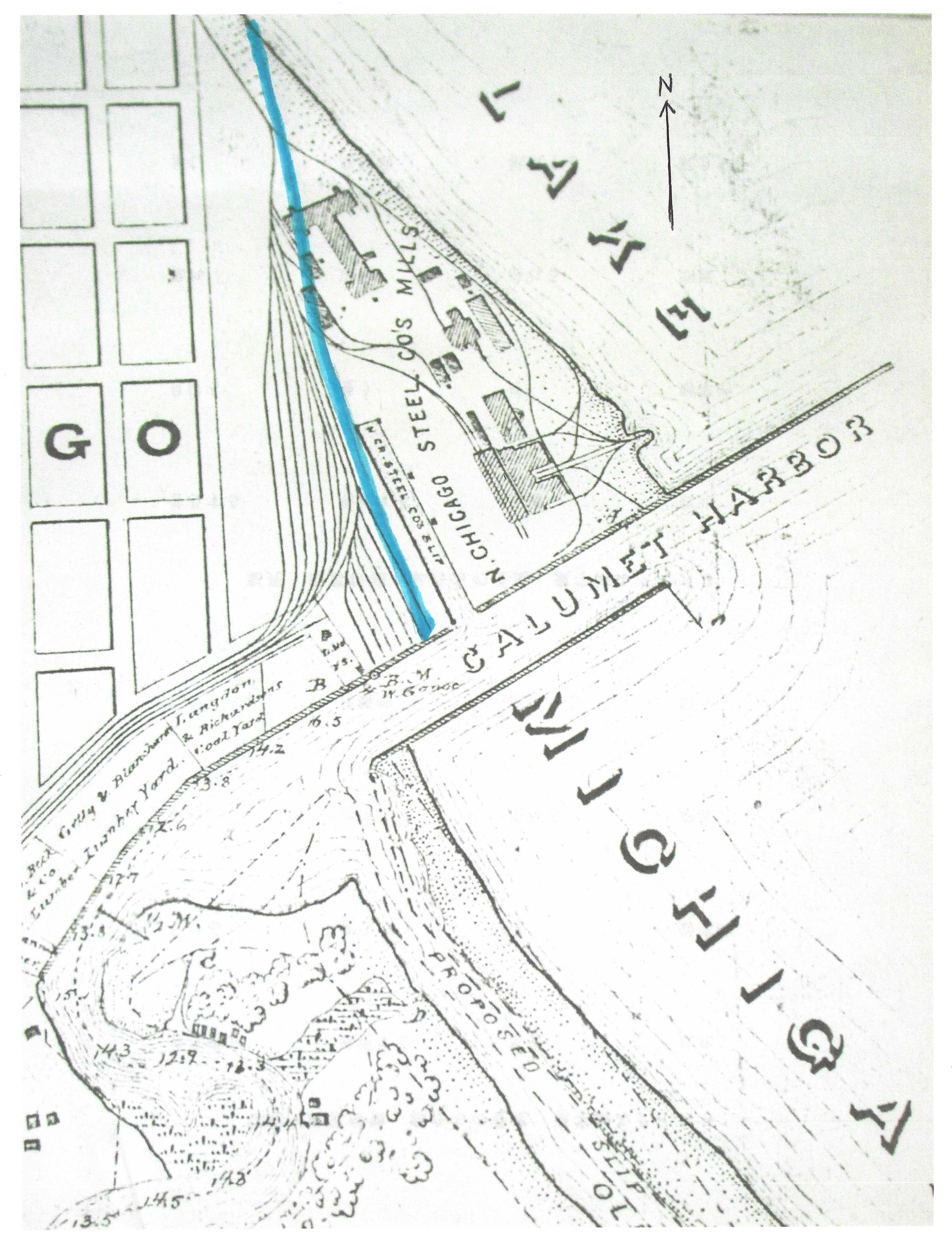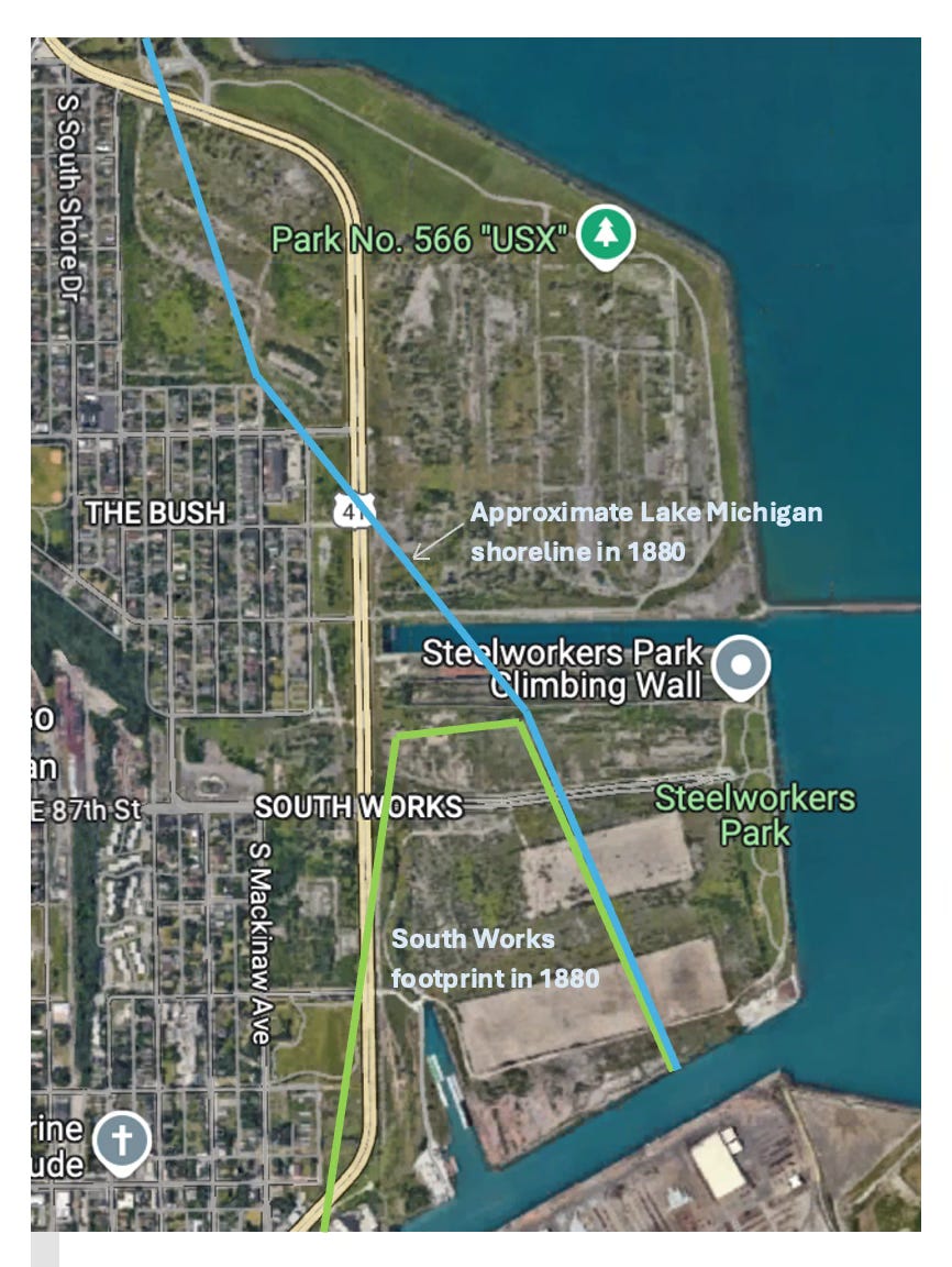 As Orrin Potter’s North Chicago Rolling Mill was gradually being surrounded by the ever expanding metropolis of Chicago, he saw the Calumet River area as the ideal place for a larger, integrated plant, where he could smelt iron, make steel and roll rails all in one location, unencumbered by a city hall complaining about noise and pollution. In 1880, on the north bank of the Calumet, he procured 73 acres—1,500 feet of frontage on the Calumet River and 2,500 on Lake Michigan. Almost this entire area was landfill, comprised of river sludge and industrial waste that was dumped there between 1869 and 1880 by companies like Wisconsin Steel. The blue line on the map below shows the approximate location of the Lake Michigan shoreline in 1869. In 11 years, the shoreline was pushed a quarter mile east out into Lake Michigan.